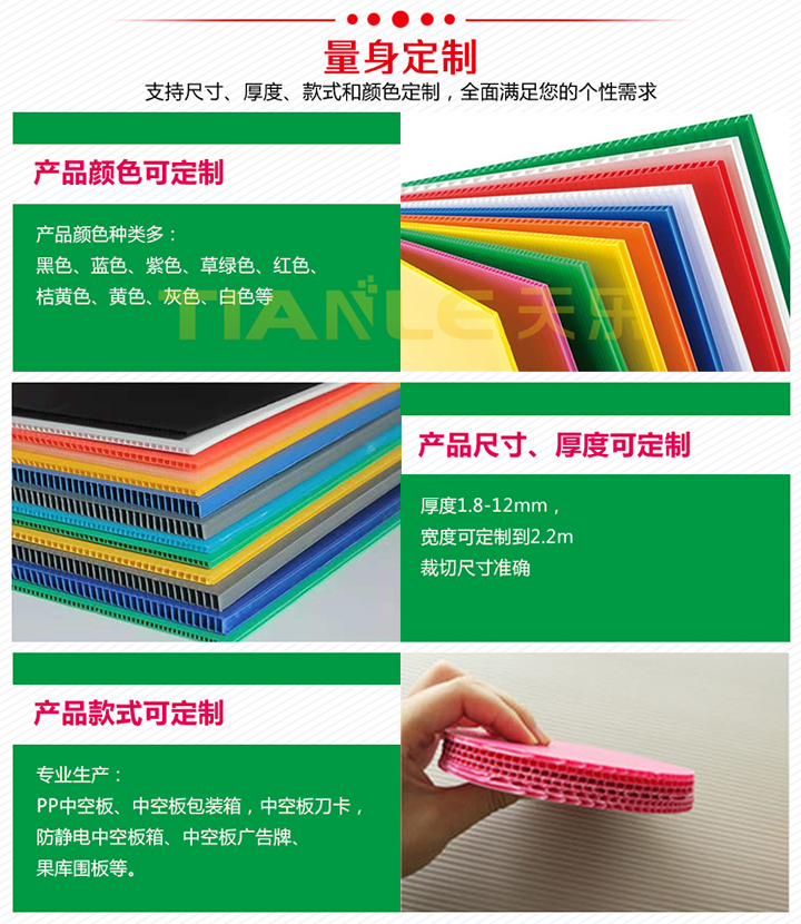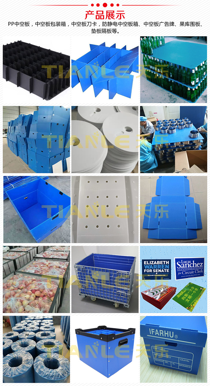 PP中空板是我天樂(lè)公司支柱產(chǎn)業(yè)之一,與塑料托盤(pán)、環(huán)衛(wèi)分類(lèi)垃圾桶組成推動(dòng)天樂(lè)公司發(fā)展的三駕馬車(chē),年產(chǎn)量4000余噸。主要有PP中空板、PP中空板包裝箱、PP中空板刀卡、PP防靜電中空板箱、PP中空板廣告牌、果庫(kù)圍板、墊板隔板等產(chǎn)品。中空板產(chǎn)品可按照客戶(hù)要求定制尺寸、厚度、款式和顏色。產(chǎn)品廣泛應(yīng)用于建筑行業(yè)、廣告行業(yè)、箱包行業(yè)、瓶罐行業(yè)、農(nóng)業(yè)、汽配行業(yè)、煙草包裝、工廠(chǎng)內(nèi)部周轉(zhuǎn)、展覽展示、節(jié)日工藝品等行業(yè),產(chǎn)品通過(guò)SGS環(huán)保認(rèn)證及歐盟RoHS檢測(cè)。