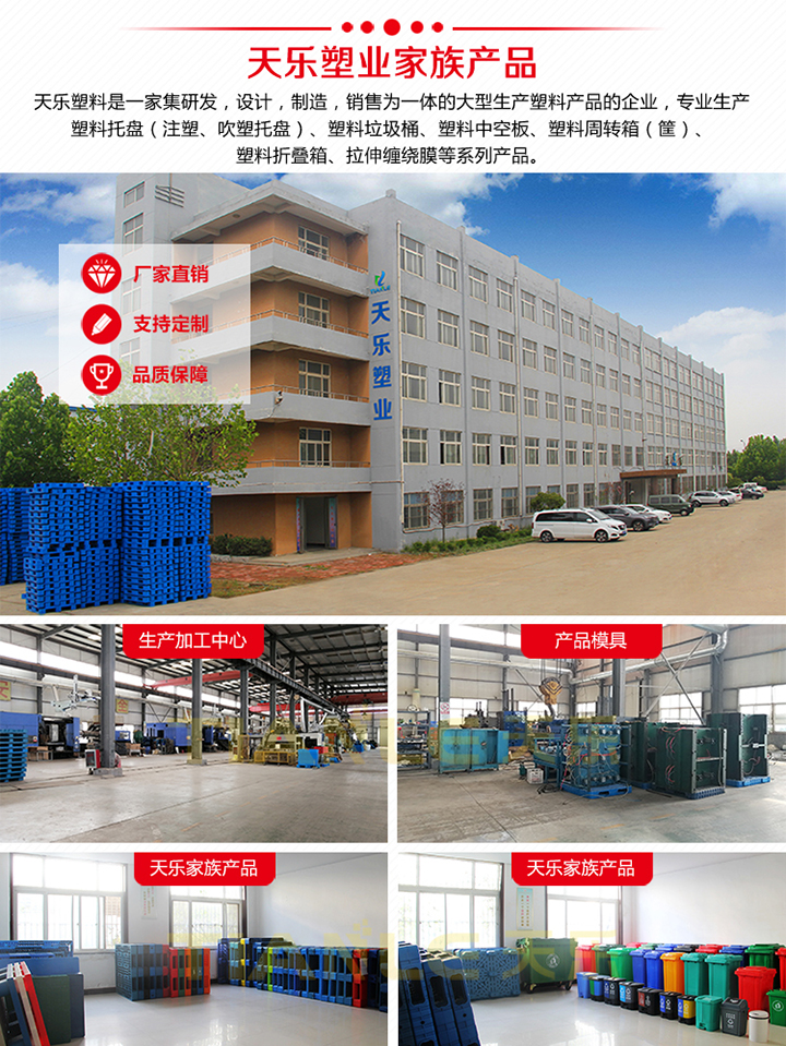 山東天樂塑料科技有限公司是一家集研發(fā),設(shè)計(jì),制造,銷售為一體的大型生產(chǎn)塑料產(chǎn)品企業(yè),公司擁有大型注塑、吹塑成型設(shè)備十多臺,擁有經(jīng)驗(yàn)豐富的設(shè)計(jì)研發(fā)團(tuán)隊(duì),可提供產(chǎn)品定制服務(wù)。專業(yè)生產(chǎn)塑料托盤(注塑、吹塑托盤)240L、120L、100L、50L、30L塑料垃圾桶、40L、20L雙胞胎(雙桶、干濕分離)垃圾桶、660L掛車?yán)啊⒅悄芾啊⑺芰现苻D(zhuǎn)箱(筐)、塑料折疊箱、PP中空板、拉伸纏繞膜等系列產(chǎn)品。垃圾桶產(chǎn)品適用于城市街道、小區(qū)物業(yè)、學(xué)校醫(yī)院、各類公共廣場、餐飲飯店、夜市大排檔、鄉(xiāng)鎮(zhèn)環(huán)衛(wèi)、市政環(huán)衛(wèi)、工廠企業(yè)、花園公園、車站碼頭、風(fēng)景名勝區(qū)等場所。塑料托盤適用于倉儲物流、電商快遞、食品醫(yī)藥、糧油面粉、煙酒飲料、商場超市、印刷印務(wù)、電子電器、化工化肥、服裝紡織、汽車汽配、五金工具、重工機(jī)械等行業(yè)。塑料垃圾桶產(chǎn)品適用于城市街道、小區(qū)物業(yè)、商業(yè)樓宇、星級賓館、學(xué)校醫(yī)院、各類公共廣場、餐飲飯店、夜市大排檔、鄉(xiāng)鎮(zhèn)環(huán)衛(wèi)、市政環(huán)衛(wèi)、工廠企業(yè)、花園公園、車站碼頭、風(fēng)景名勝區(qū)等場所。