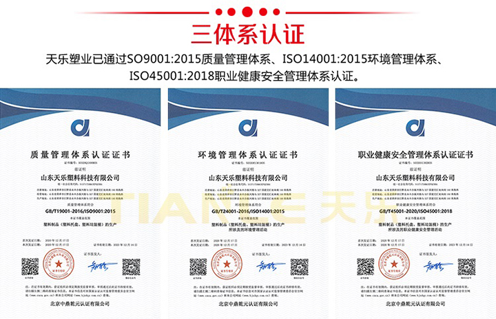 圣誕節(jié)前夕,天樂塑業(yè)公司迎來了“雙喜臨門”,我公司順利通過ISO質量管理、環(huán)境管理、職業(yè)健康安全管理三體系認證,AAA企業(yè)信用等級認證。2020年天樂塑業(yè)公司獲得了突飛猛進的發(fā)展,感謝客戶的每一次認可,