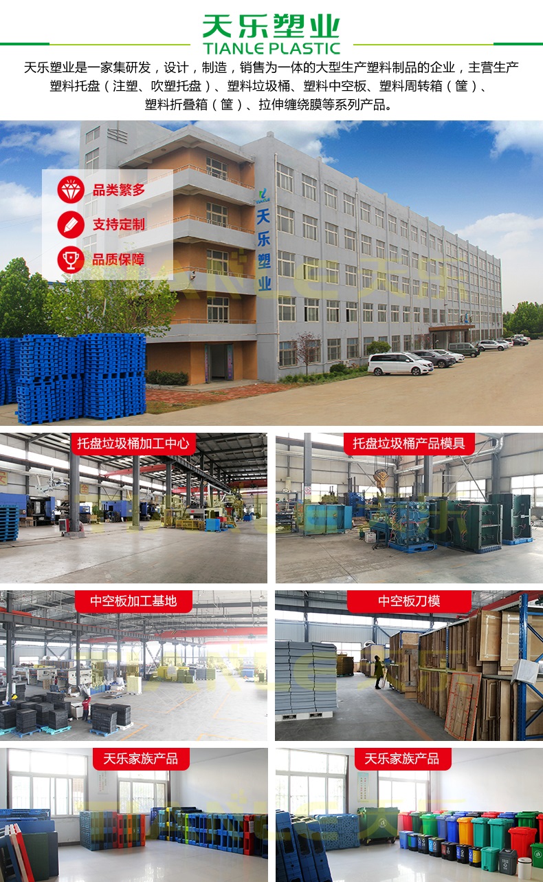 主營(yíng)生產(chǎn)塑料托盤(pán)(九腳、雙面吹塑托盤(pán);川字、田字、九腳、雙面注塑托盤(pán))、240L/120L/100L/50L/30L塑料垃圾桶、40L/20L雙胞胎垃圾桶、660L掛車?yán)啊⒅悄芾啊⑺芰现苻D(zhuǎn)箱(筐)、塑料折疊箱(筐)、PP中空板、拉伸纏繞膜等系列產(chǎn)品。
